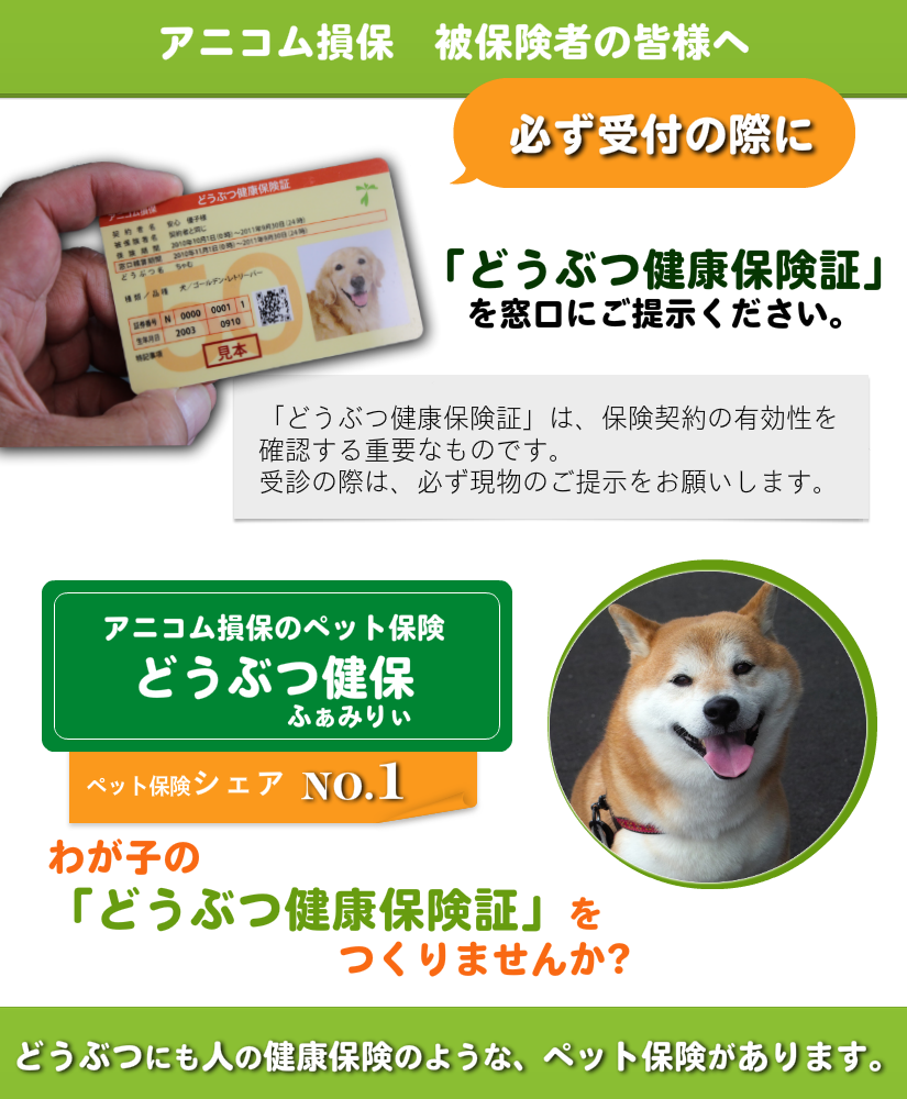 当院の窓口では「アニコム」「アイペット」と提携しています。その場でご精算できます。他の保険会社は診療明細書と必要書類をご用意できますのでご自分でご請求ください。